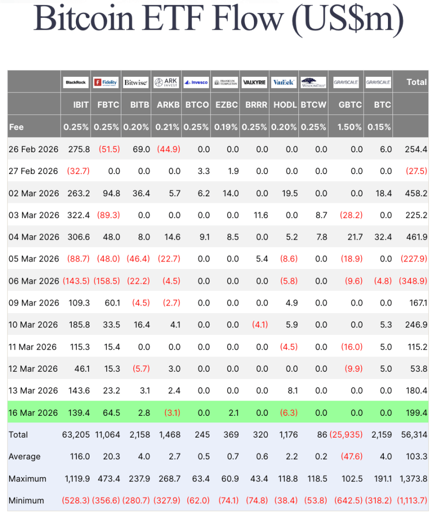The best proof for this lies in ETFs. Farside data shows that spot Bitcoin ETFs saw $199.4 million in inflows on March 16, marking the sixth consecutive day of inflows after two days of heavy redemptions.